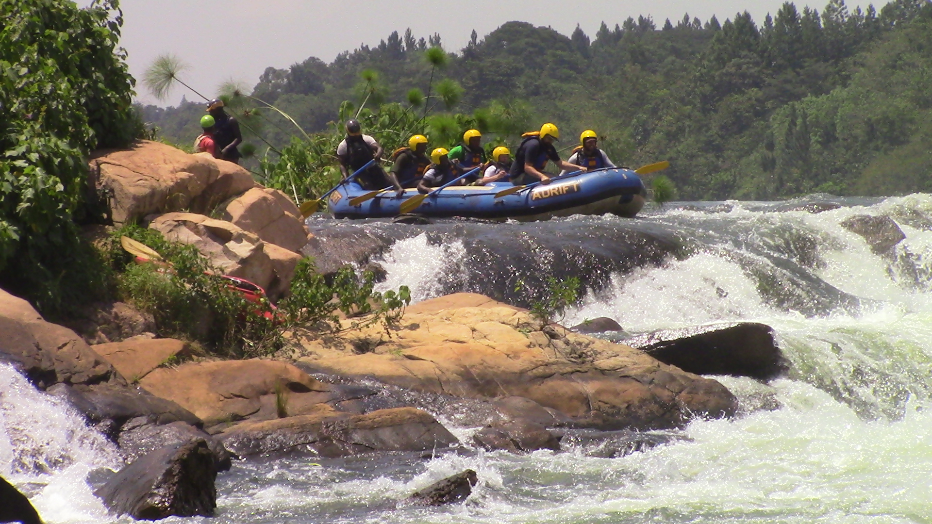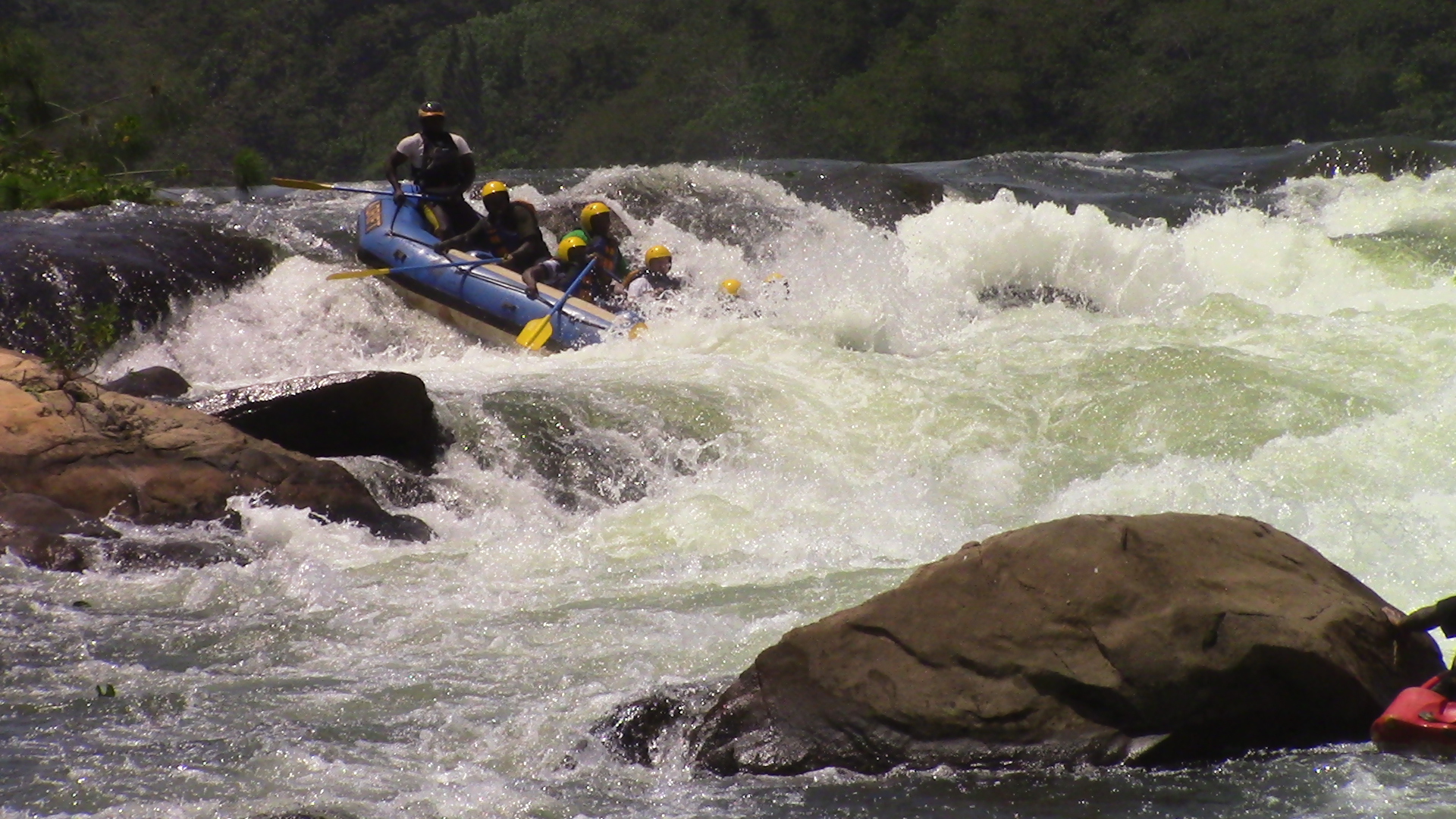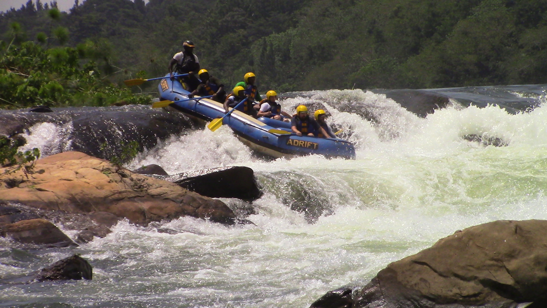 The trip on the water begins slowly and the first few kilometres give the raft guides an opportunity to train their crews fully on all aspects of Nile rafting. The river becomes much more adventures at Bujagali Falls and one major rapid follows swiftly after another for most of the morning. Once the rafts enter Wildwaters Reserve (protects the unique flora and fauna of the mid‐stream islands of the Nile), there is more time between the rough water but the rapids become larger and more spectacular. At Itanda (The Bad Place) the Nile is too powerful for the rafts and so the rafts are taken around the top by land.